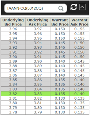 For example, traders can consider entering a position by buying TAAN-CQ at RM0.135, when TAAN-CQ is Bid RM0.130/0.135 Ask & its underlying stock TAAN is RM3.81/RM3.82